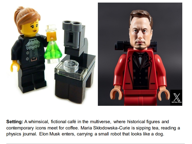 Narrator: And so, Maria Skłodowska-Curie and Elon Musk began their improbable partnership, bridging the gap between radioactive discoveries and futuristic tech... with a barking robot along for the ride.