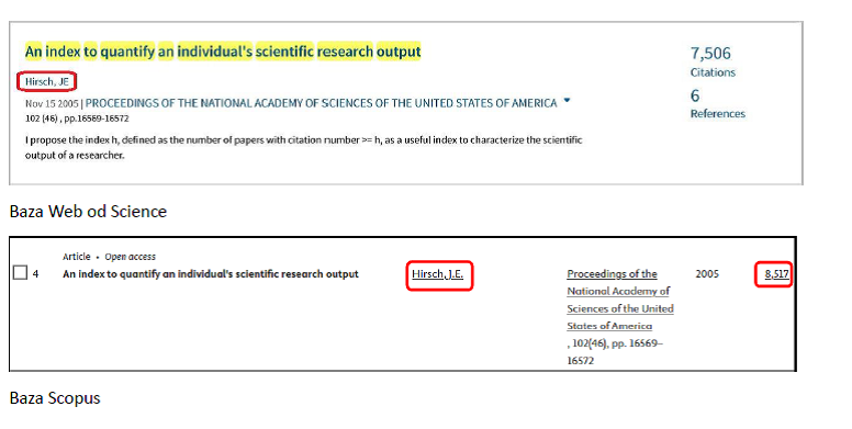Poniższe zrzuty z baz Web of Science i Scopus pokazują cytowania znaczącej publikacji Jorge E. Hirscha (3), w której zaproponował wskaźnik, nazwany finalnie od jego nazwiska, czyli tzw. h-index (Indeks Hirscha). Liczba cytowań wspomnianej publikacji dynamicznie wzrasta, począwszy od daty publikacji do chwili obecnej.