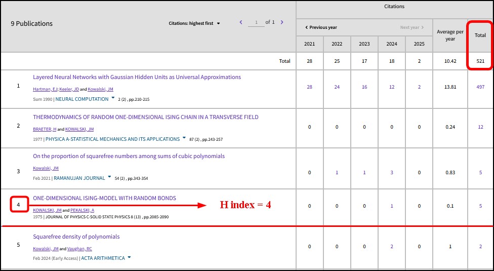 Prace zostały automatycznie uszeregowane malejąco od największej liczby cytowań. W podanym przykładzie indeks Hirscha określa publikacja z liczbą porządkową 4. Tyle wynosi wartość tego współczynnika. Oznacza to, że 4 prace spośród wszystkich publikacji autora są cytowane 4 lub więcej razy. Jeśli publikacja z liczbą porządkową 5 zyska przynajmniej trzy kolejne cytowania, wówczas Indeks H autora wyniesie 5. Jak widzimy łączna liczba cytowań, która wynosi 521 nie ma wpływu na wartość h-indeksu. Podobnie najwyżej cytowana, pierwsza na liście praca (blisko 500 cytowań) nie podnosi wartości tego wskaźnika.